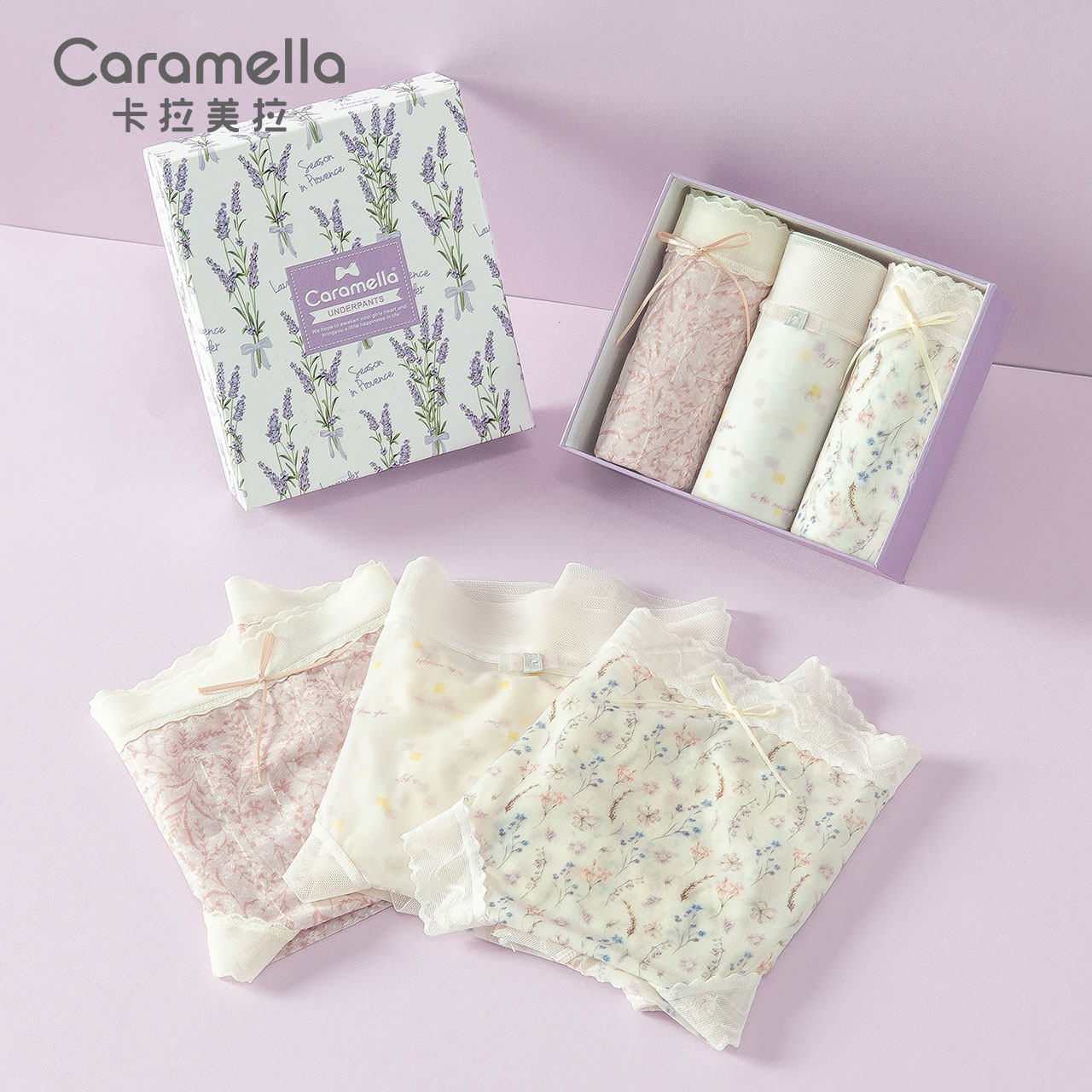 【产品名称:caramella无痕内裤女士夏天中腰透气薄款网纱礼盒装碎花三角短裤】