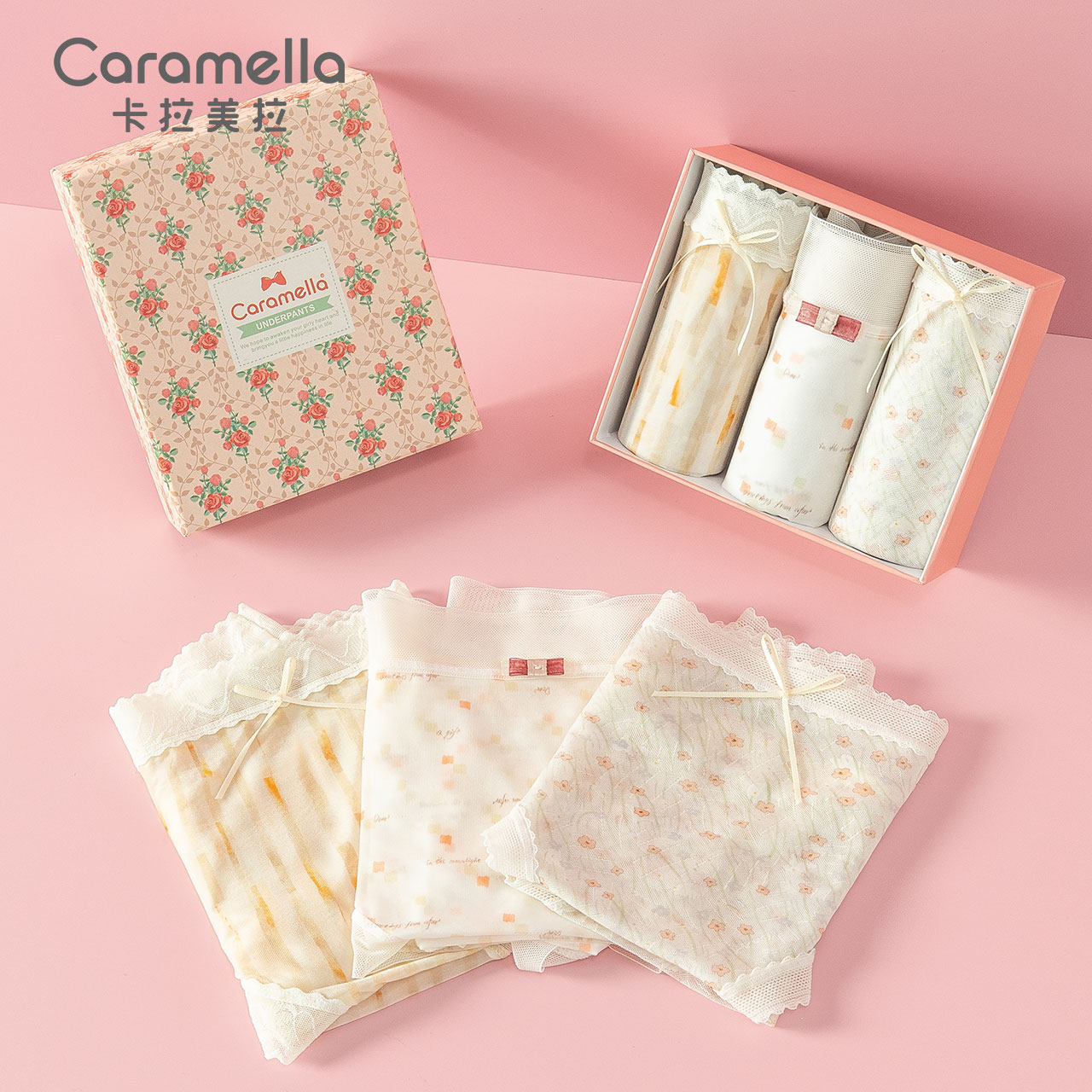 【产品名称:caramella女士内裤中腰无痕网纱透气夏季薄款碎花三角短裤礼盒装】