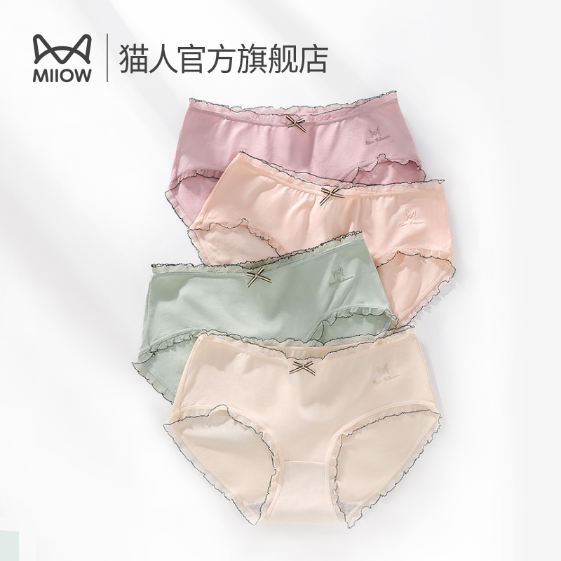【产品名称:猫人50支纯棉女士内裤女抑菌少女蕾丝边短裤提臀收腹女生三角短裤】