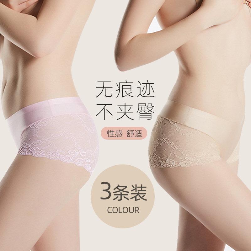 【产品名称:蕾丝无痕女士内裤冰丝提臀一片式纯棉底裆女士中腰平角内裤】