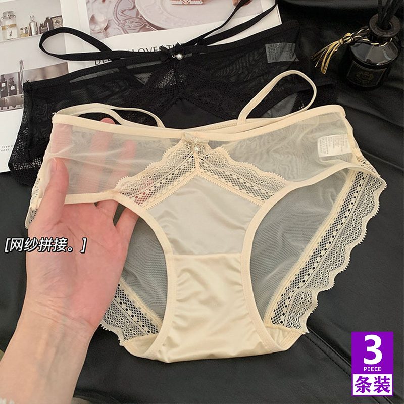 【产品名称:纯欲性感蕾丝网纱少女内裤缎面交叉细带透气棉裆低腰女士三角裤】