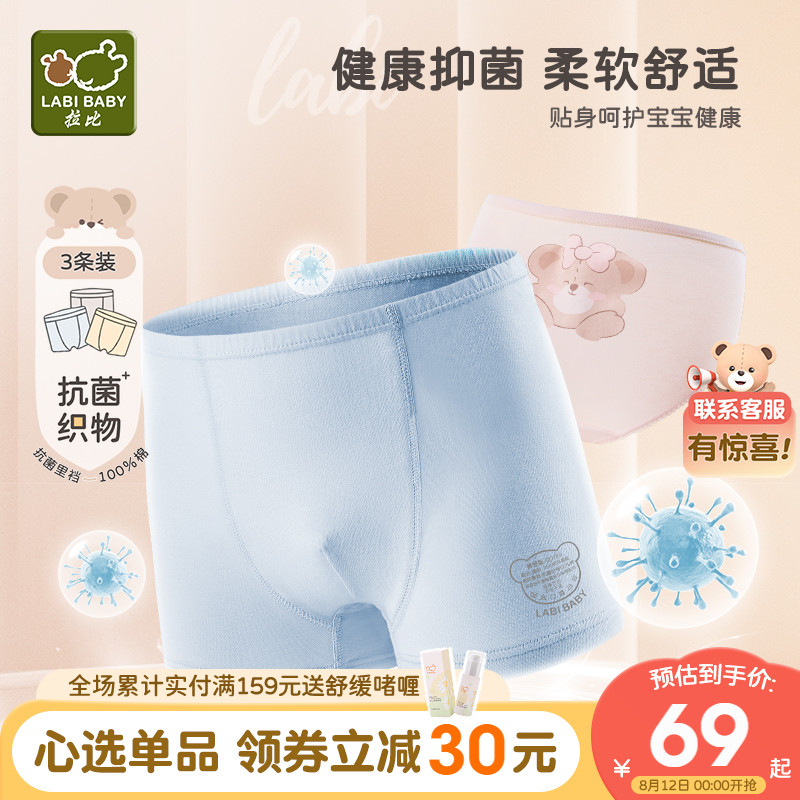 【产品名称:拉比童装2023新款女儿童内裤3条装男童三角四角棉内裤不夹PP内裤】