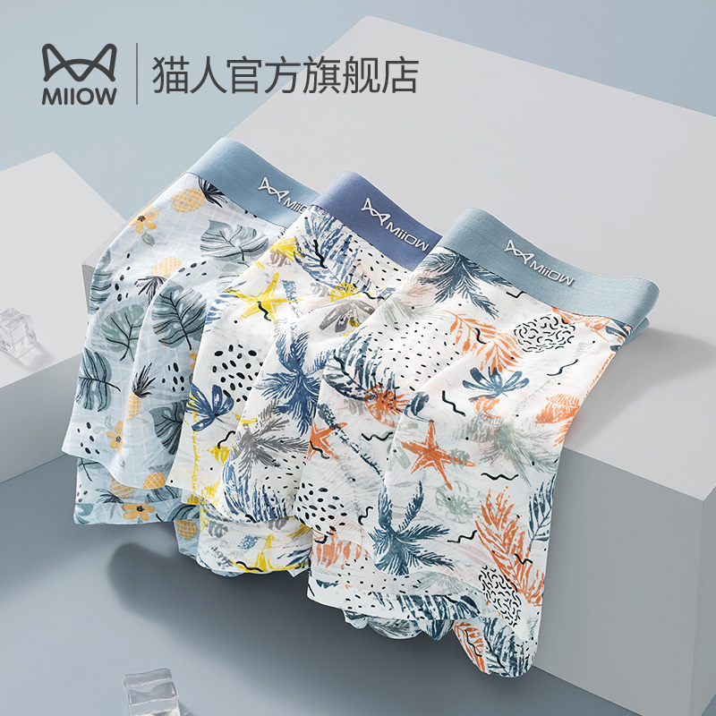 猫人冰丝男士内裤抑菌透气男生夏季印花裤衩薄款四角短裤头平角裤