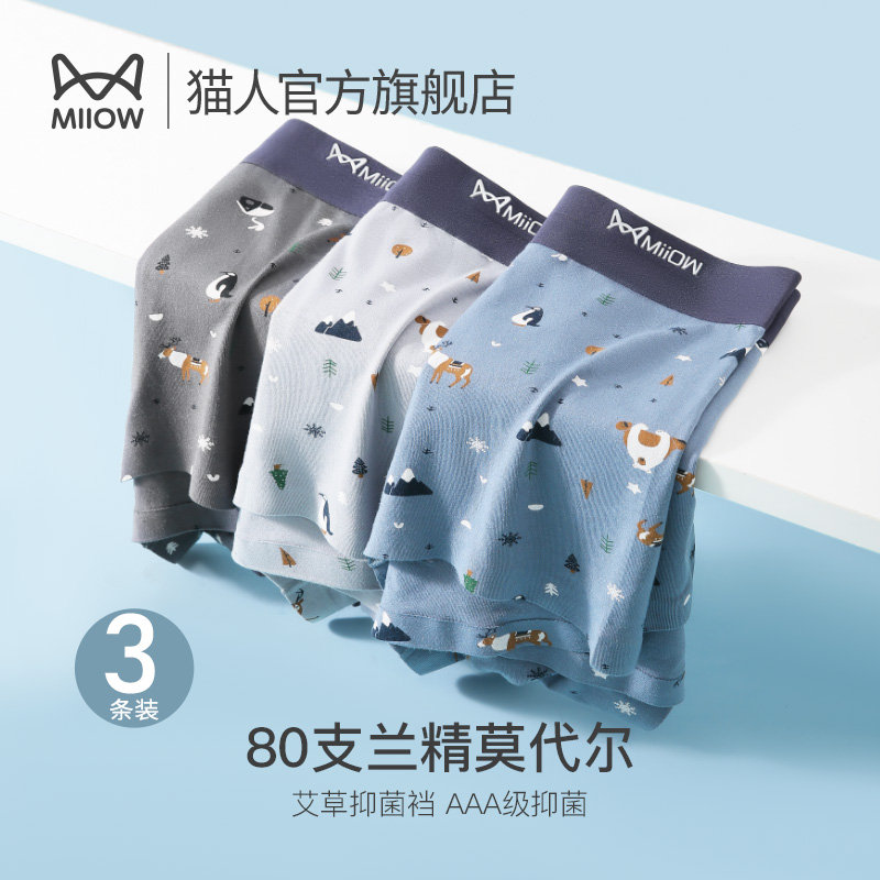 【产品名称:猫人80支莫代尔男士内裤运动青少年印花平角裤抑菌透气男短裤头D2】