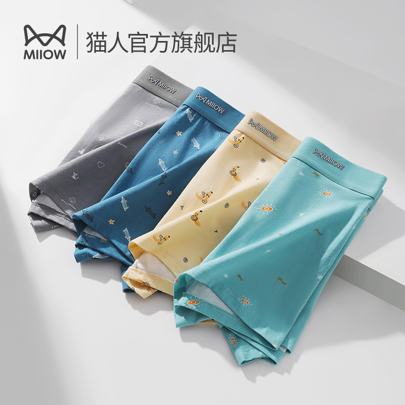 【产品名称:猫人男士内裤纯棉四角夏季薄款透气男生印花款式大码平角短裤衩E1】