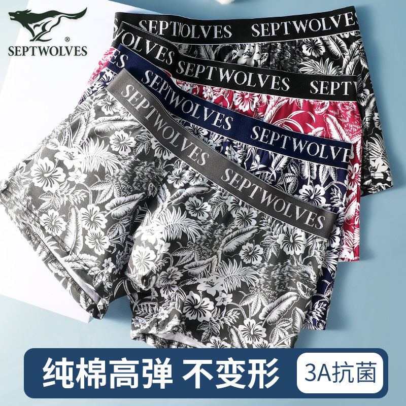 【产品名称:七匹狼2023新款男士内裤男款纯棉四角高档印花平角薄棉短裤衩夏天】