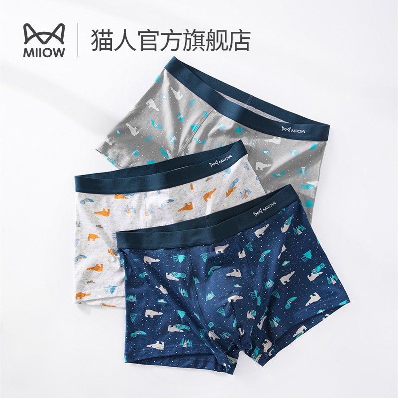 【产品名称:猫人60支纯棉男士内裤夏季透气无痕四角裤头青少年印花平角短裤衩】