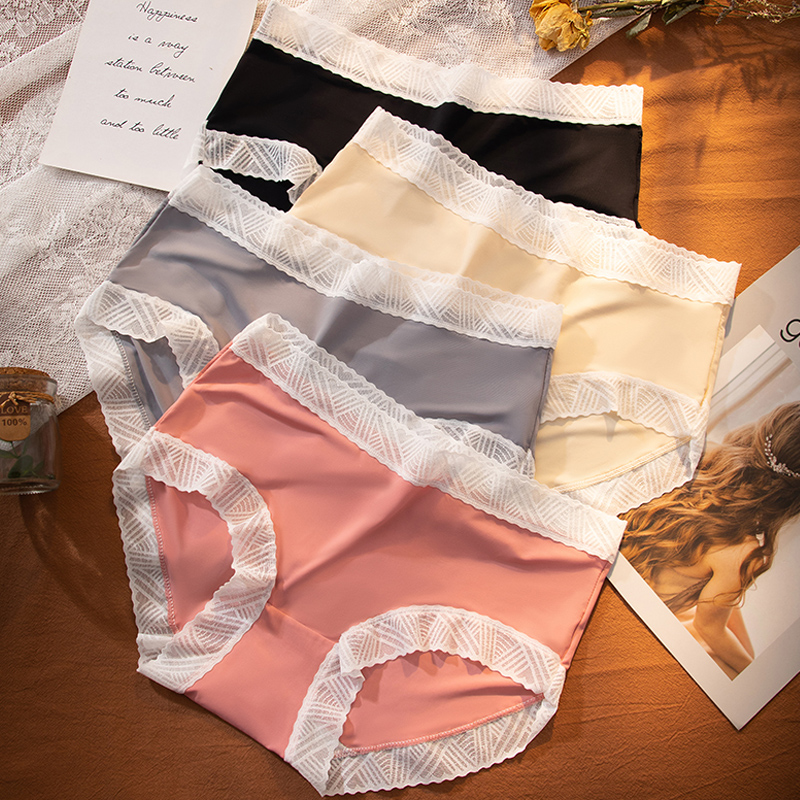 【产品名称:冰丝无痕内裤女纯棉裆中腰提臀收腹透气大码少女蕾丝甜美女士短裤】