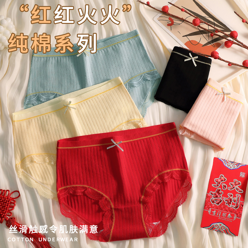 【产品名称:红色内裤女纯棉蕾丝边抗菌女生高腰少女士新款全棉本命年三角裤头】