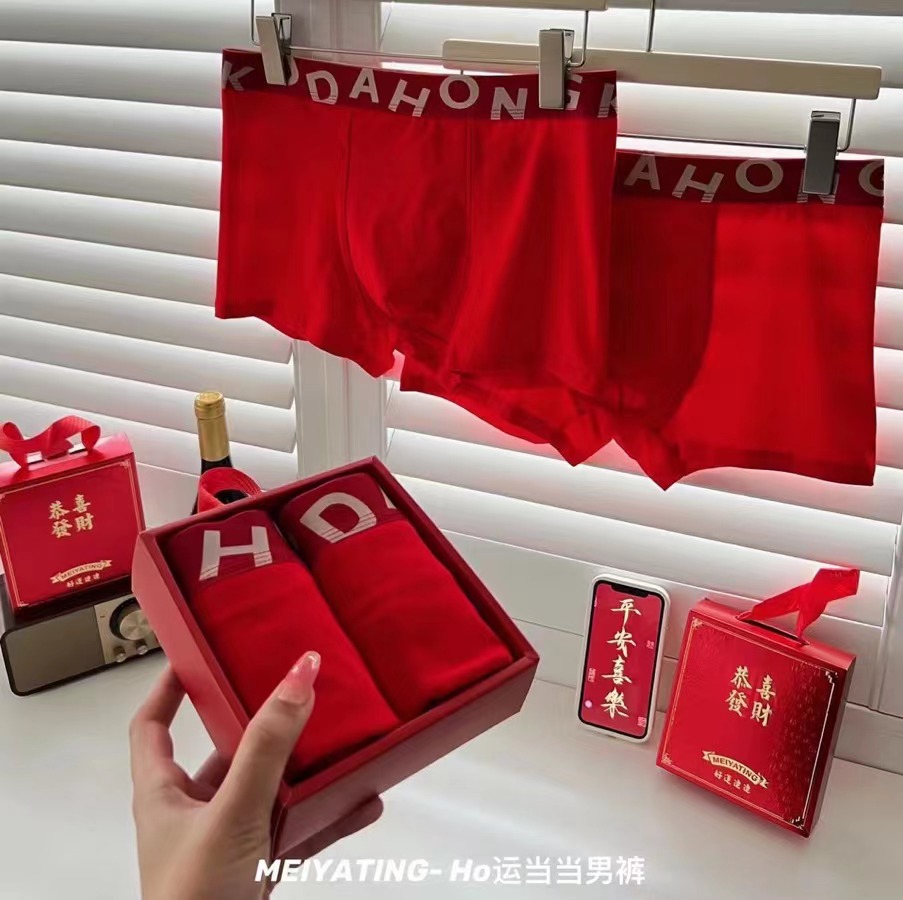 【产品名称:运当当男士平角内裤棉质抗菌2023本命年新年大红色属兔年四角短裤】