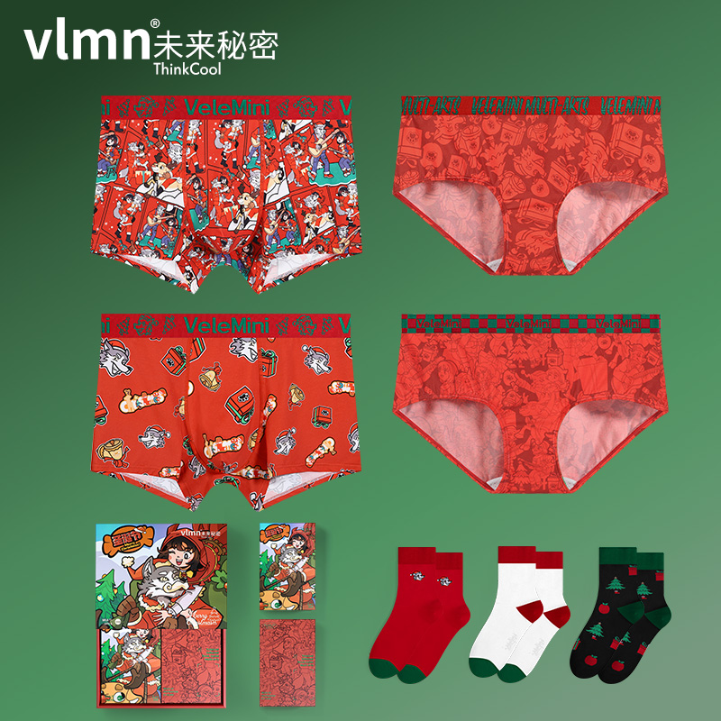 【产品名称:vlmn/圣诞情侣内裤棉质男平角裤礼盒可爱卡通中筒袜抗菌三角裤女】