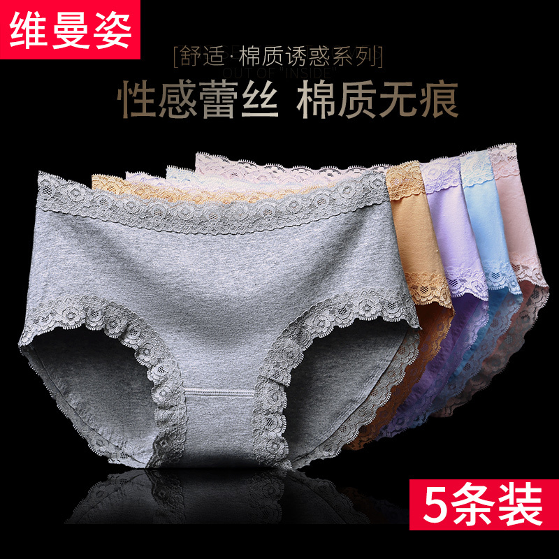 【产品名称:维曼姿5条 棉质中腰内裤女裆纯棉性感无痕蕾丝包臀性感女士三角裤】