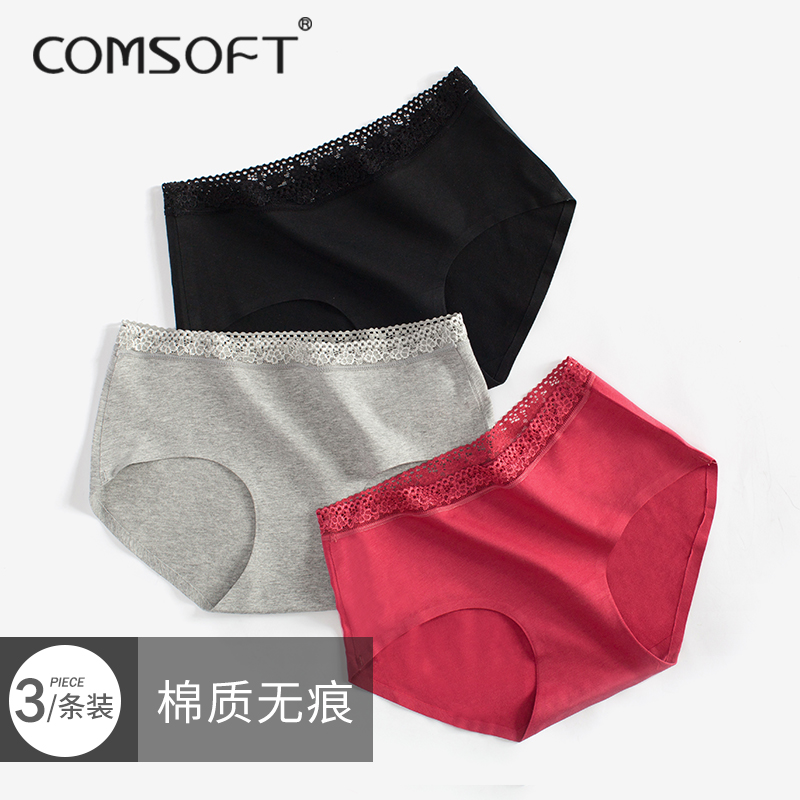 【产品名称:一片式无痕内裤女蕾丝腰筋中腰包臀三角裤大码棉质女士裤头3条装】