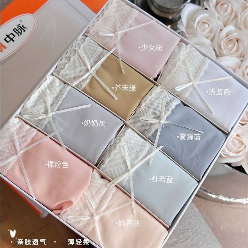 【产品名称:1019JM中脉优品舒芙蕾乳酸内裤女士三角裤蕾丝中腰抗菌八条礼盒装】