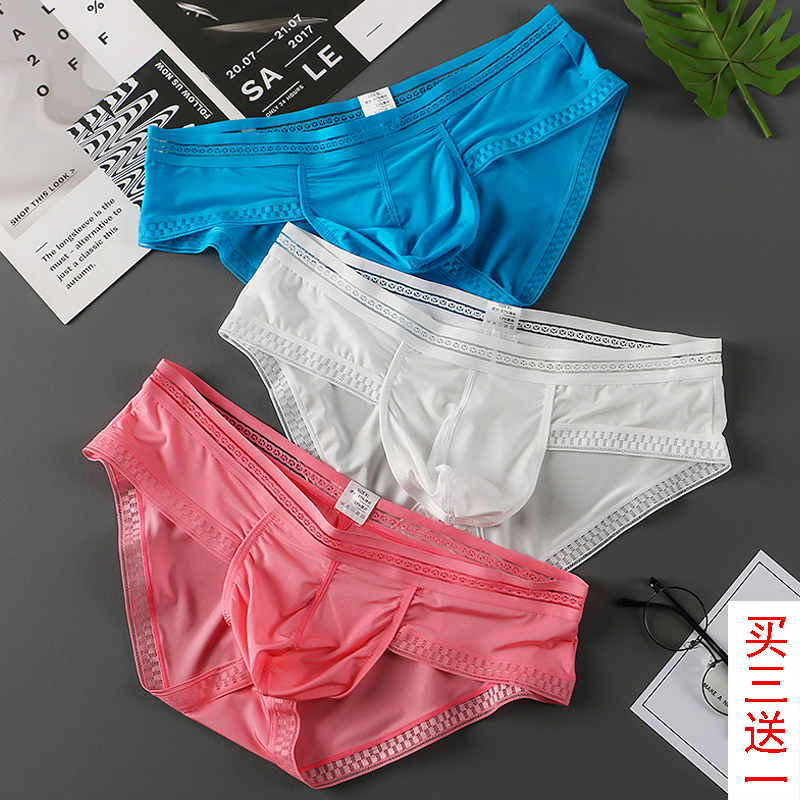 【产品名称:冰丝三角男士内裤大囊袋花纹边舒适透气U凸个性性感半透明裤衩头】
