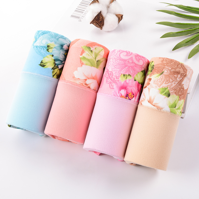 【产品名称:5条条装女士内裤女性感无痕中腰竹纤维面料胖印花收腹提臀三角裤】