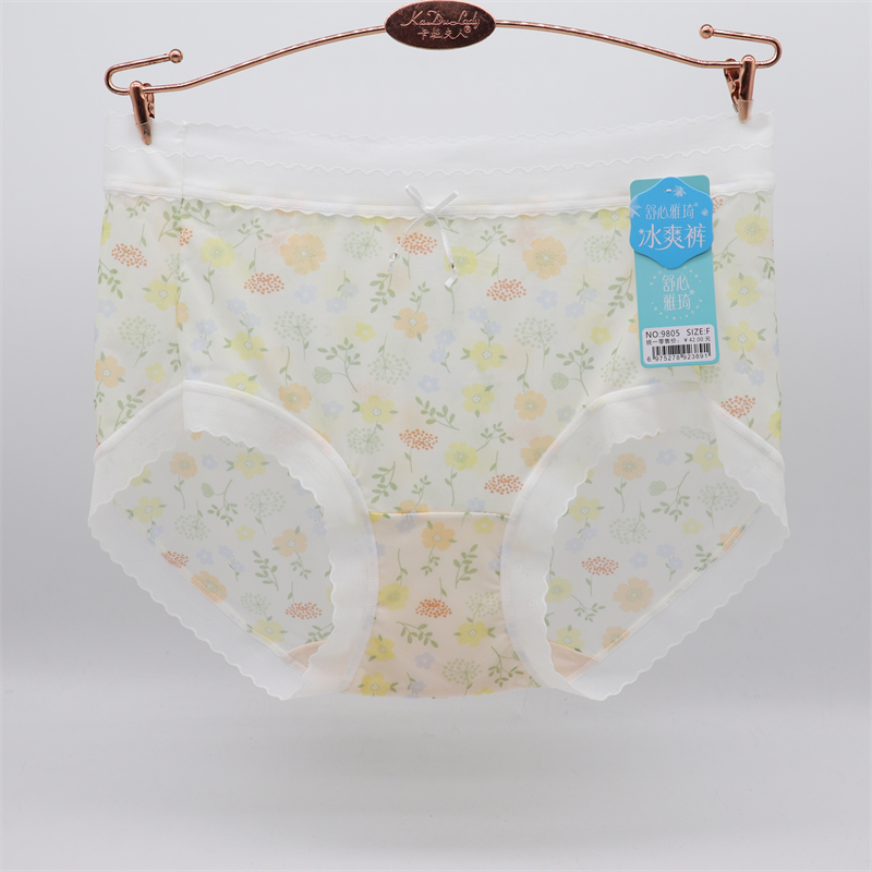 【产品名称:舒心雅琦冰爽裤内裤女速干冰丝印花蚕丝裆抗菌中腰裤头9805】