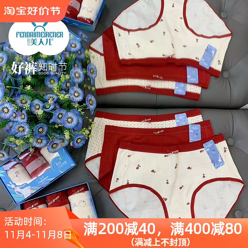 【产品名称:美人儿新款纯棉内裤女酒红色紫红3条盒装提花印花三角内裤30085AB】