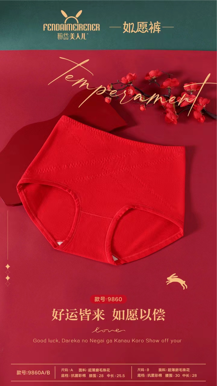 【产品名称:美人儿新款大红色内裤女纯棉磨毛高弹中高腰盒装鸿运如愿裤9860】