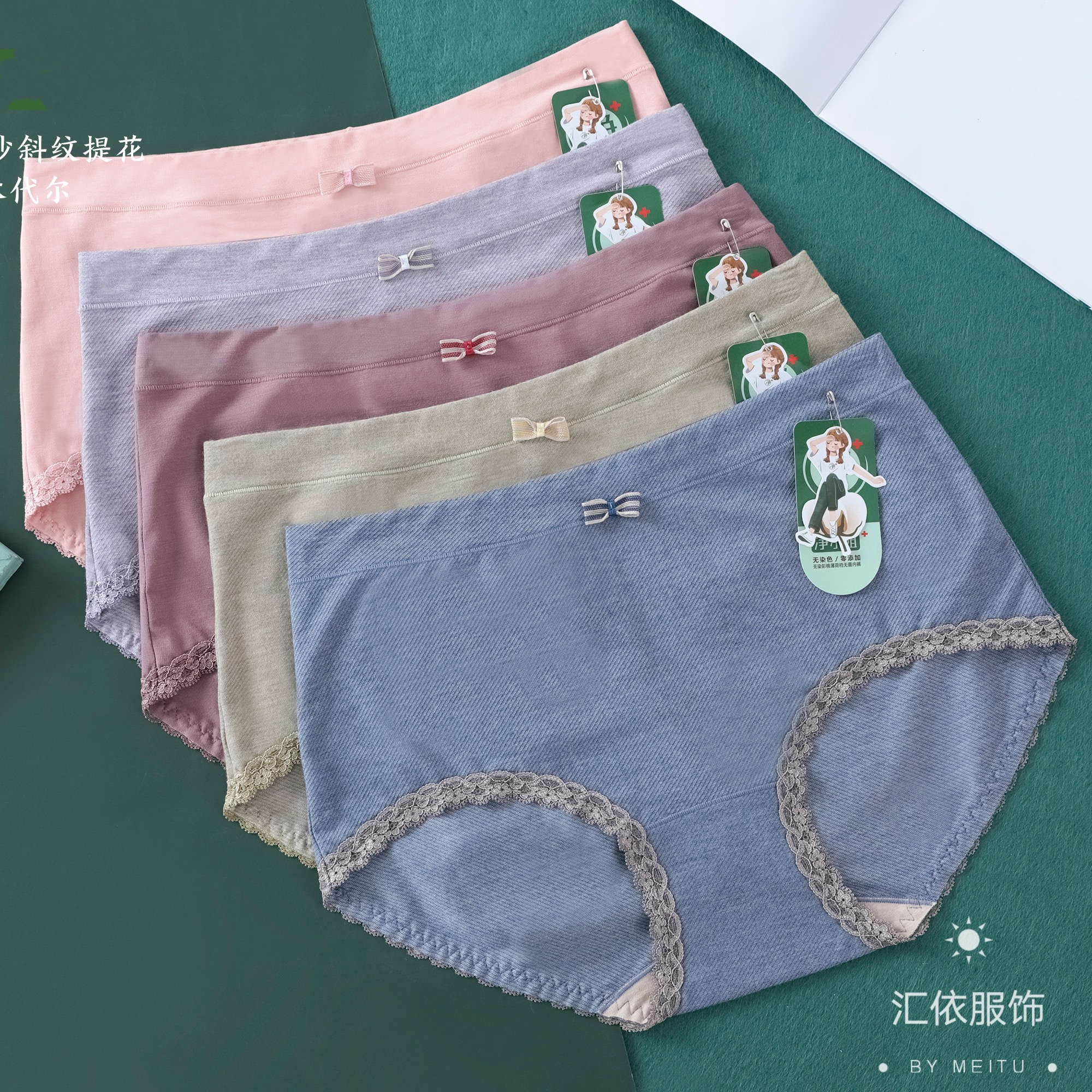 【产品名称:5条装粉岱俏美人净小姐天然彩棉薄荷底裆中腰蕾丝边女士内裤7867】