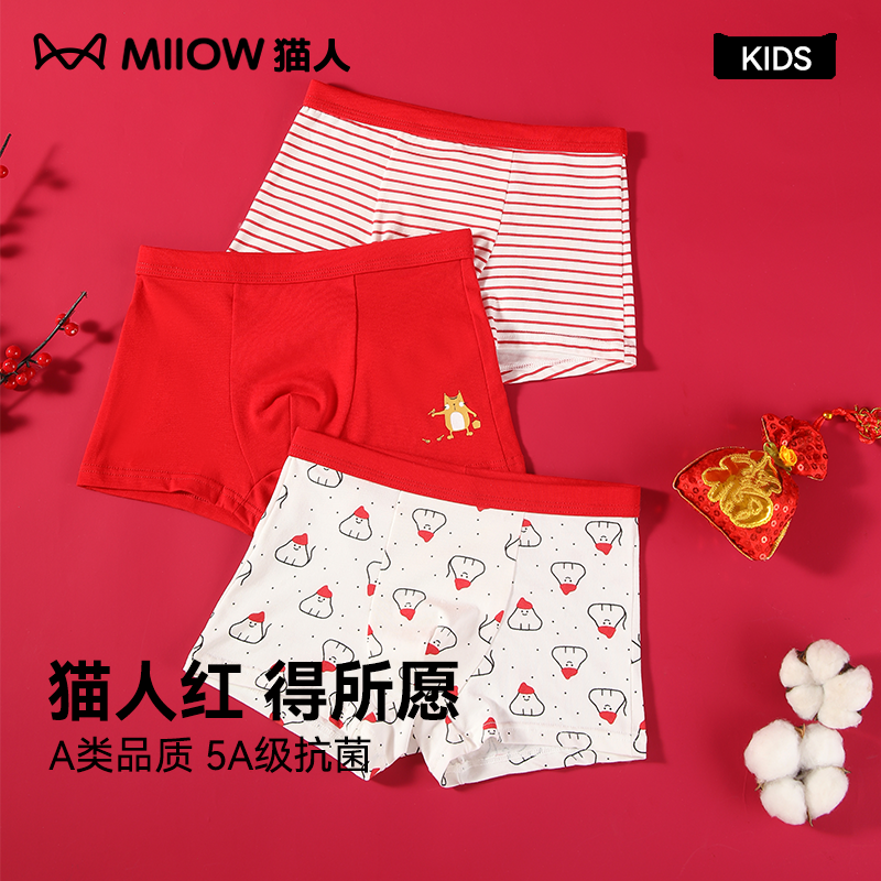 猫人儿童内裤男童四角裤衩本命年红色中大童纯棉平角短裤不夹屁屁