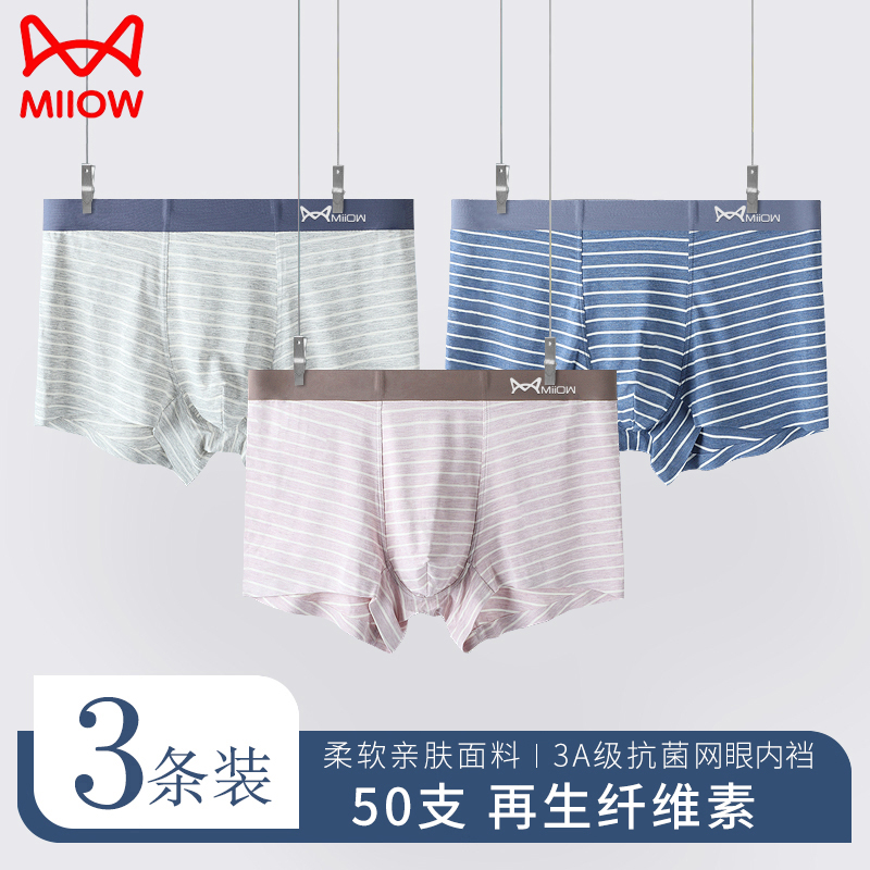 【产品名称:猫人抗菌男士内裤男四角莫代尔纯棉中腰无痕透气条纹潮流平角短裤】
