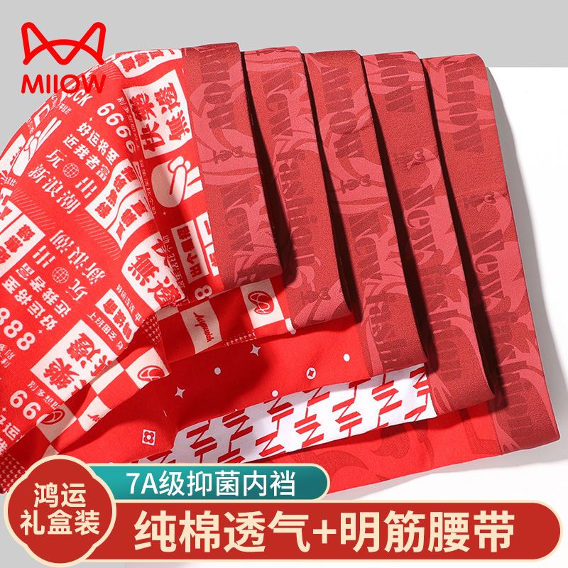 【产品名称:猫人男士内裤男平角裤纯棉抑菌透气龙年鸿运大红色男生四角短裤秋】