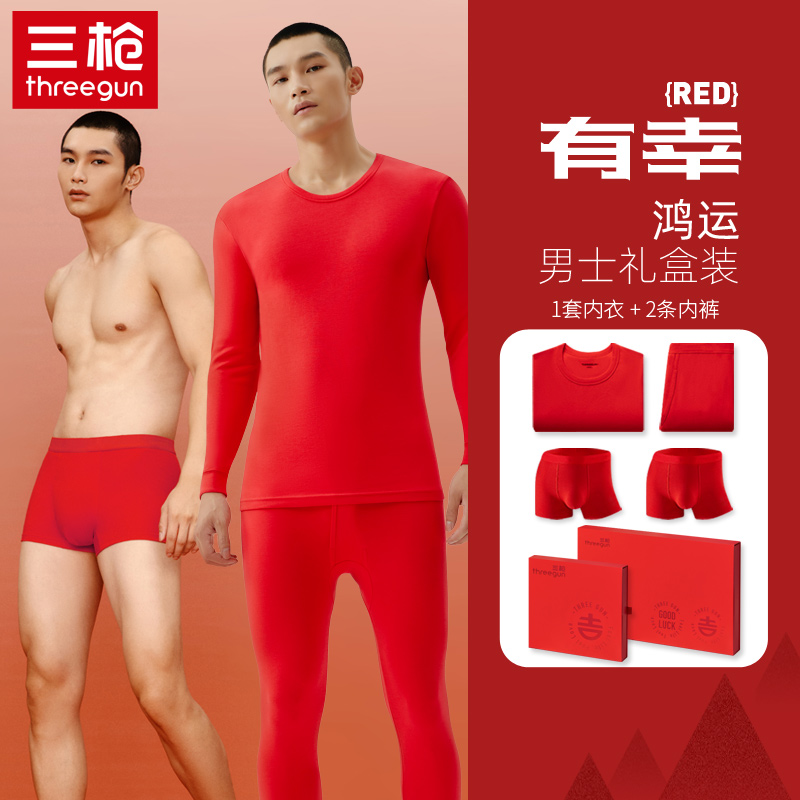 【产品名称:三枪男士纯棉红色龙年结婚喜庆本命年防寒保暖内衣套装弹力内裤】