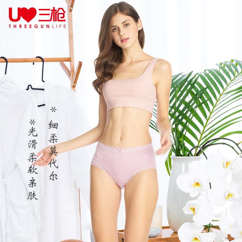 【产品名称:3条 三枪内裤女三角裤莫代尔中腰花边细柔透气女士内裤纯色弹力】