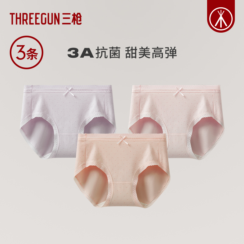 【产品名称:3条装 三枪女士内裤新品蝴蝶结印花少女内裤抗菌花边三角裤头轻薄】