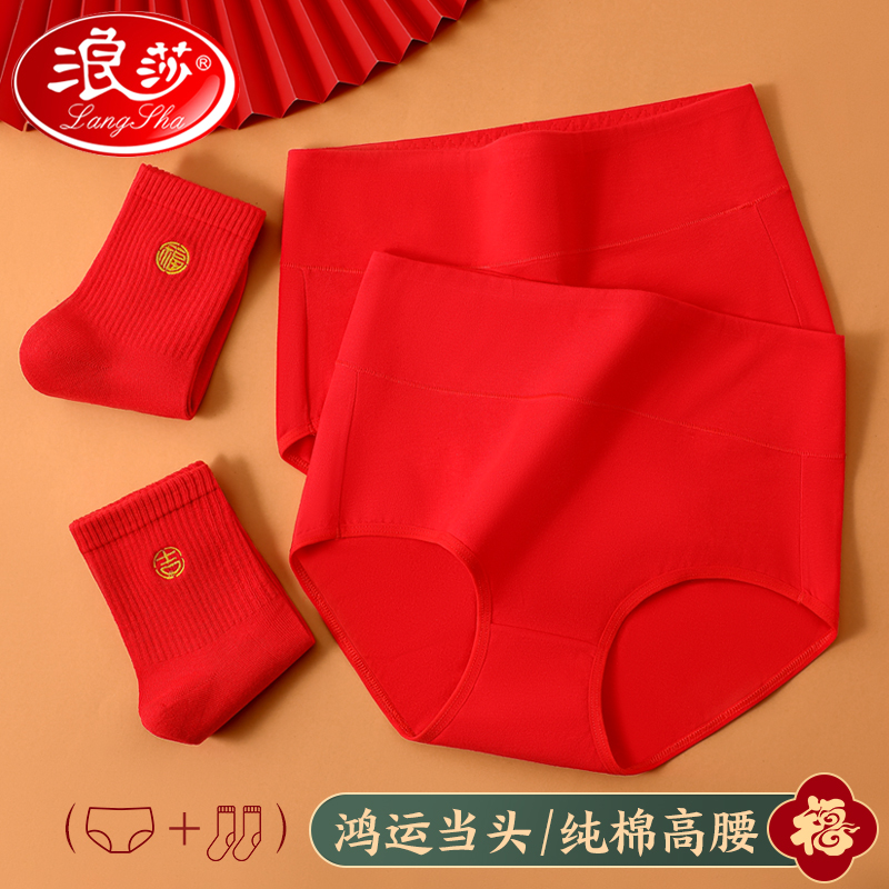 【产品名称:浪莎红内裤女士本命年属兔纯棉高腰大红色结婚红内裤袜子组合兔年】