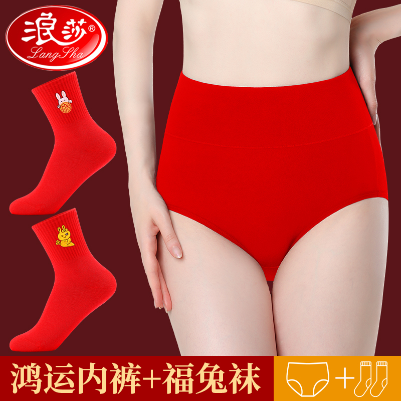 【产品名称:本命年大红色内裤女士纯棉兔年礼物高腰100%全棉内衣袜子短裤套装】