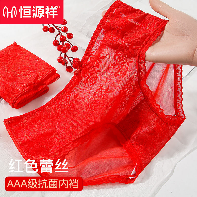 【产品名称:恒源祥本命年内裤女大红色性感蕾丝属兔结婚纯棉中腰女士三角短裤】