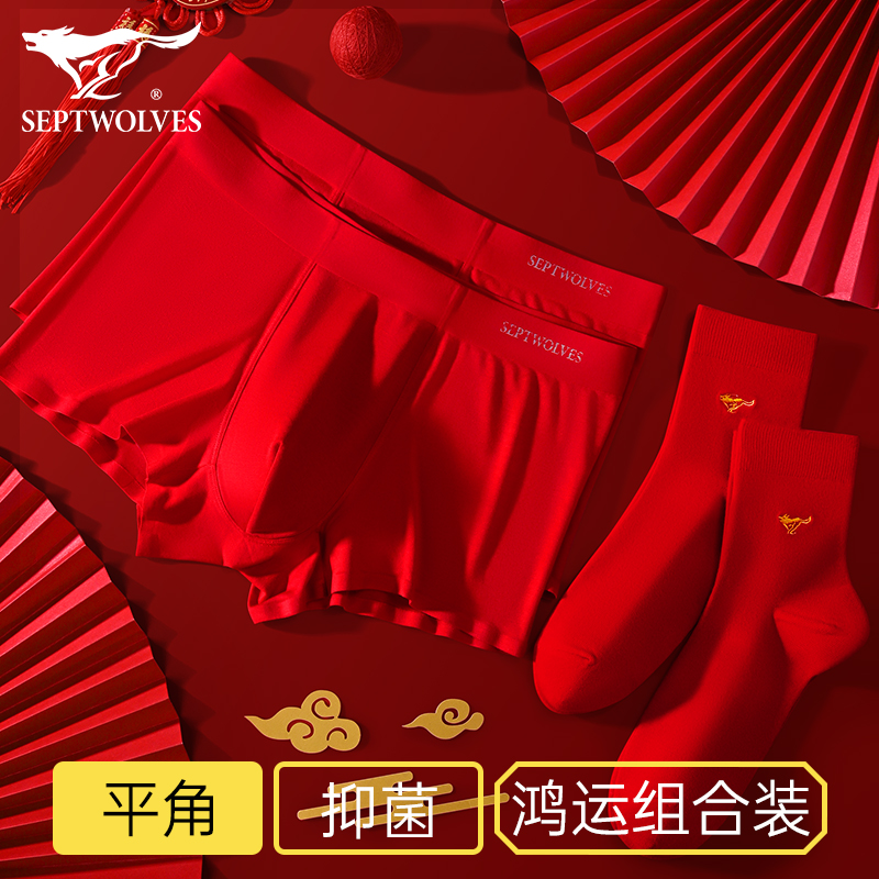 【产品名称:七匹狼本命年内裤袜子套装男士莫代尔冰丝大红色结婚龙年四角短裤】