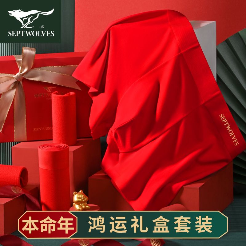 【产品名称:七匹狼兔年虎年本命年男士内裤纯棉男生大红色结婚平角裤四角短裤】