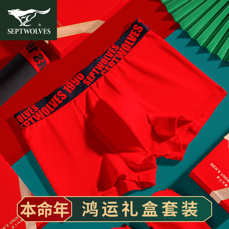 【产品名称:七匹狼兔年虎年本命年男士内裤纯棉四角短裤男生大红色结婚平角裤】
