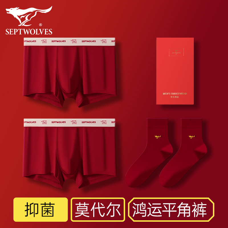 【产品名称:七匹狼男士内裤平角裤龙年本命年酒红色四角裤莫代尔新郎结婚礼物】
