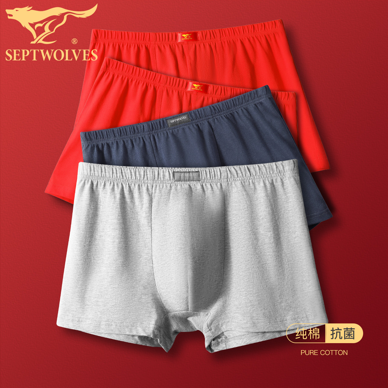 【产品名称:七匹狼男士内裤男纯棉平角裤本命年大红色全棉加肥大码四角短裤衩】