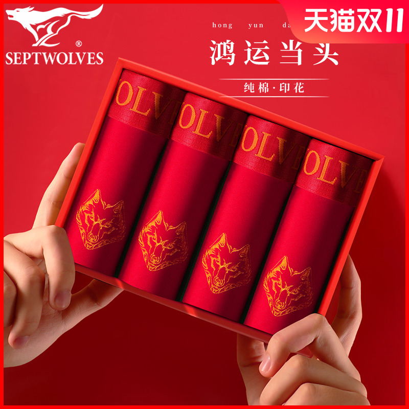 【产品名称:七匹狼本命年内裤男士纯棉新疆棉金色狼头大码抗菌透气龙年短裤头】