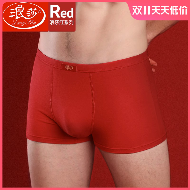 【产品名称:浪莎男士内裤红色本命年属龙纯棉大红色结婚平角龙年四角红短裤男】