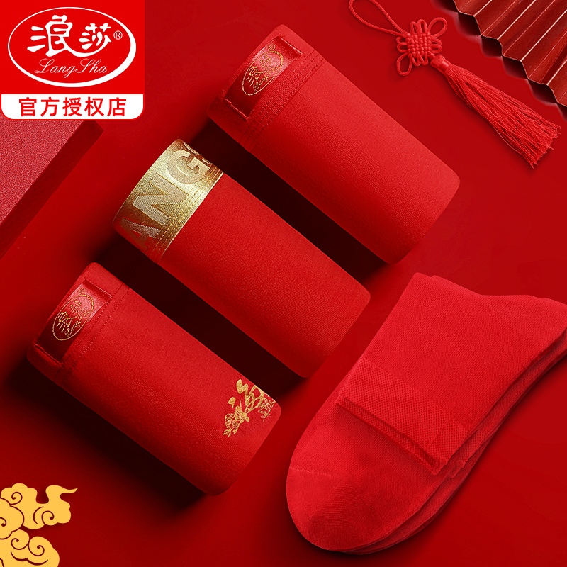 【产品名称:浪莎男士红内裤本命年属兔纯棉平角四角裤结婚喜庆兔年大红色短裤】