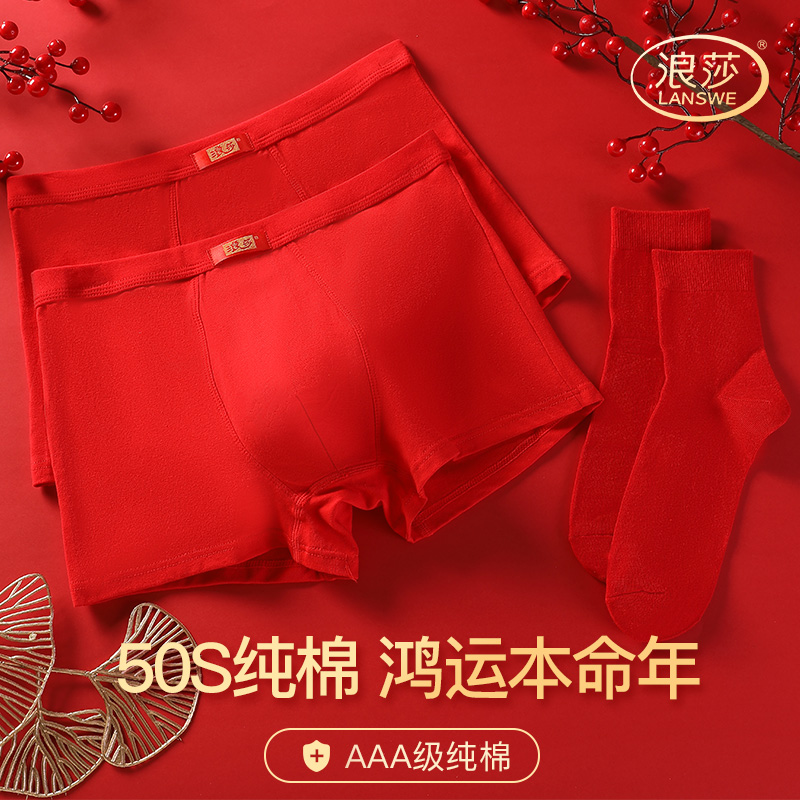 【产品名称:浪莎本命年男士内裤男生兔年大红色纯棉四角裤男款结婚礼物短裤】