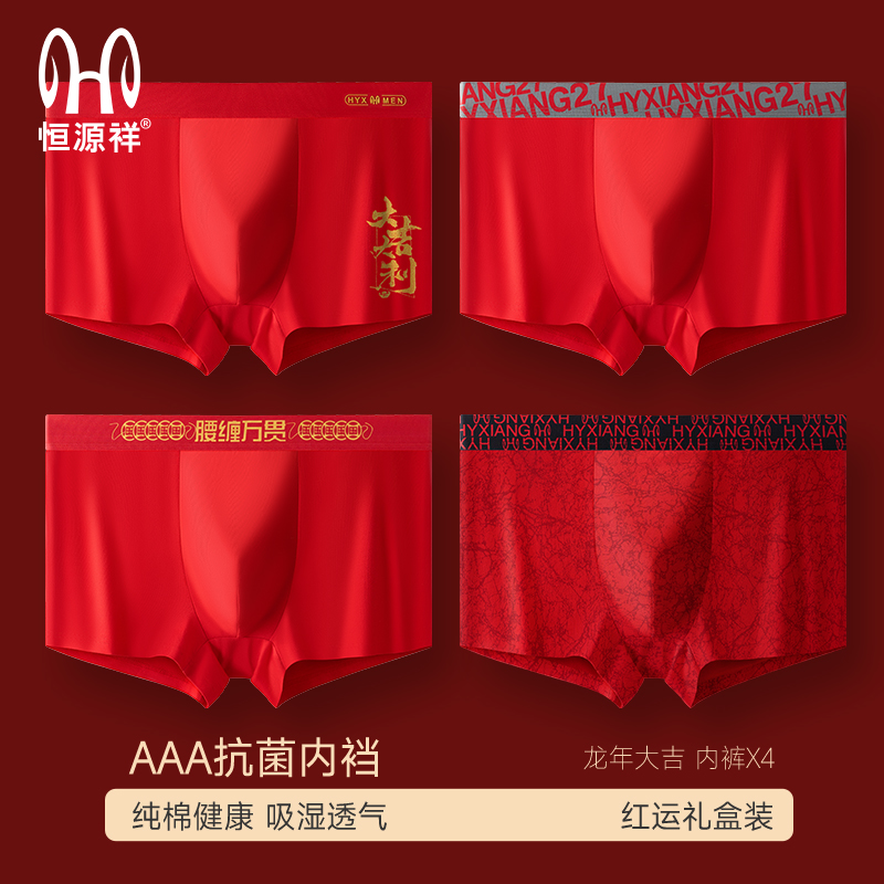 【产品名称:恒源祥本命年男士内裤纯棉大红色新郎结婚四角龙年平角裤男生短裤】