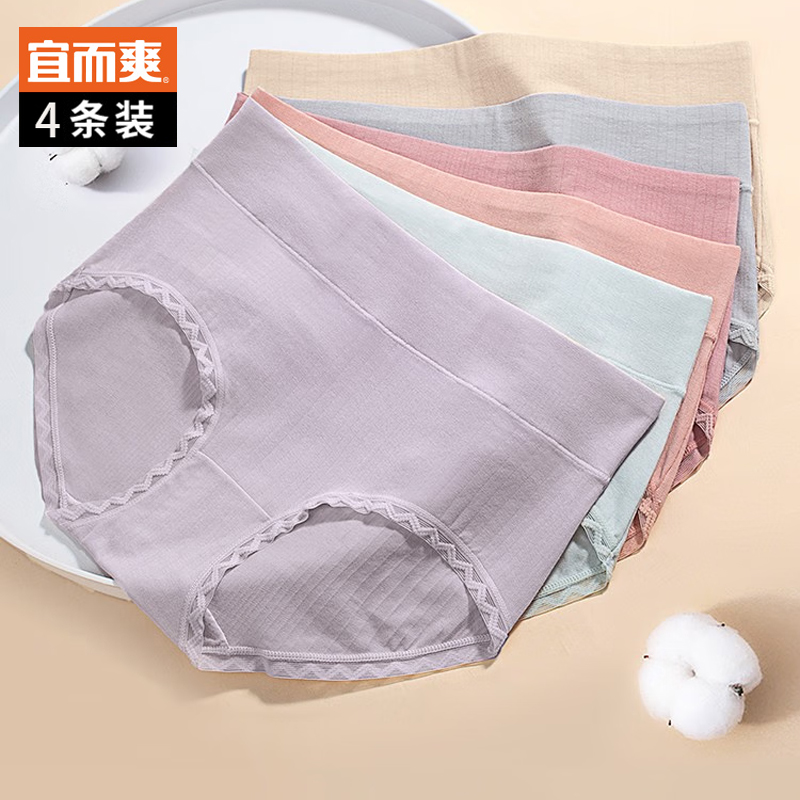 【产品名称:宜而爽内裤女纯棉3A抗菌吸湿透气高弹花纱抽条柔软女士中腰三角裤】