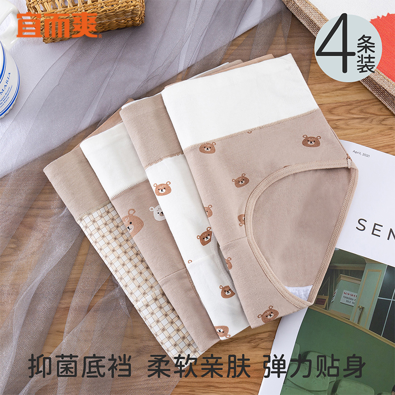 【产品名称:4条装 宜而爽女内裤高腰纯棉抗菌防夹臀小熊印花可爱少女三角内裤】