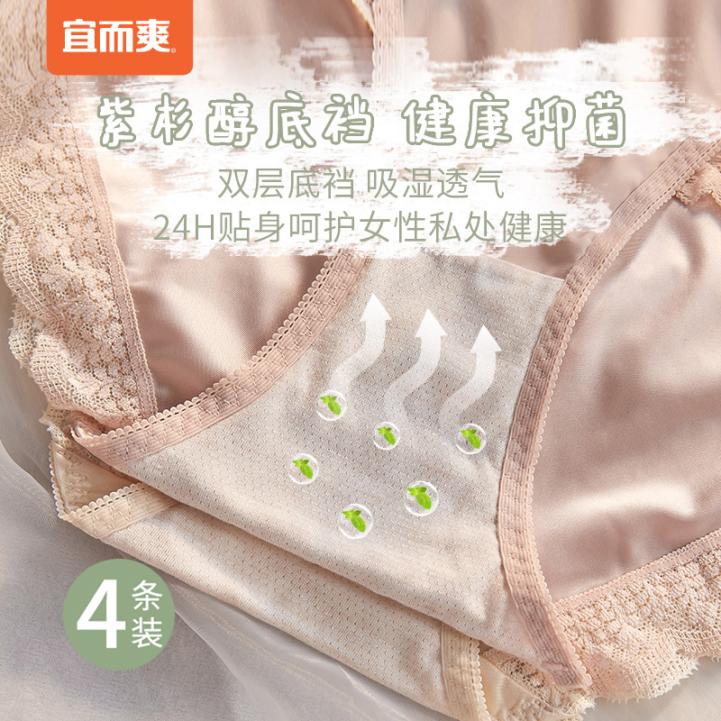 【产品名称:宜而爽女锦纶缎面抑菌内裤 绸缎丝滑凉爽三角裤性感蕾丝提臀4条装】