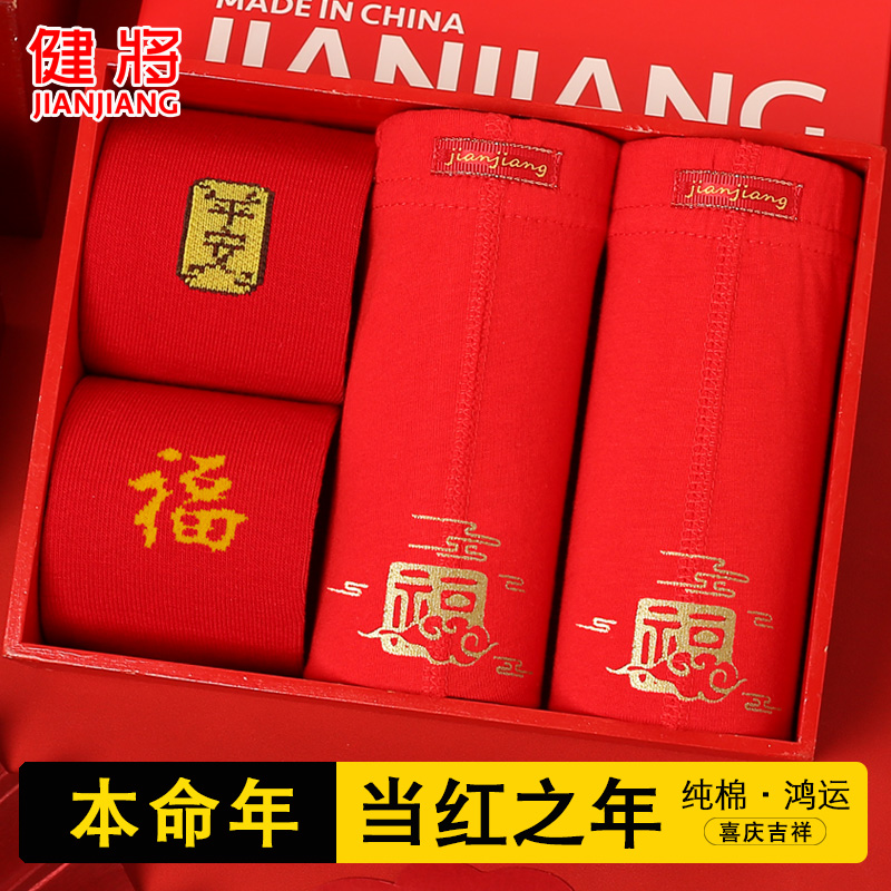 【产品名称:健将男士内裤纯棉四角裤100%全棉本命年大红色结婚兔年男式平角裤】