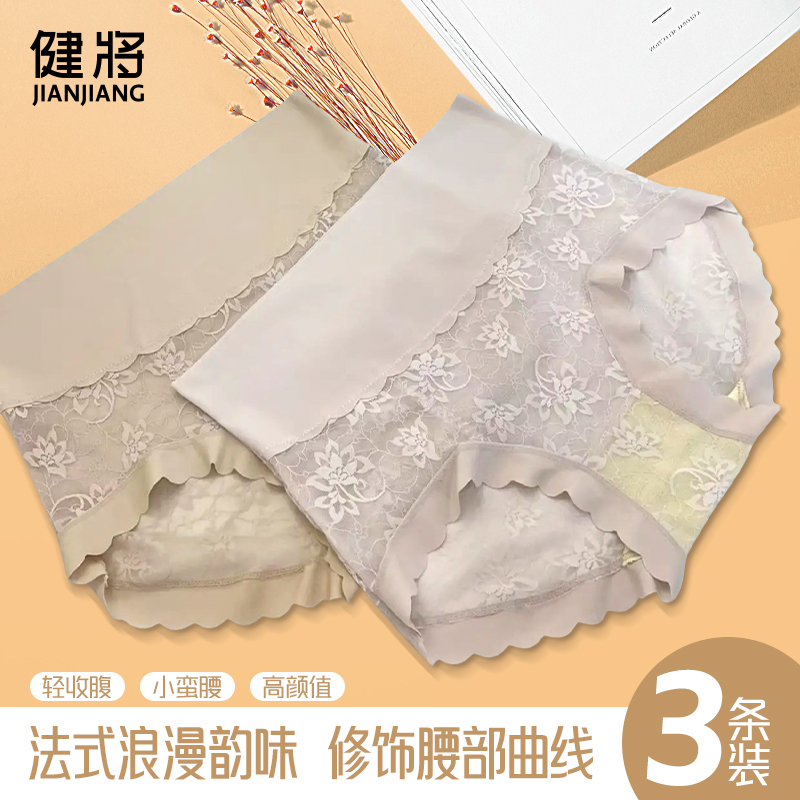 【产品名称:健将高腰内裤女士蕾丝性感小平角无痕腰边三角裤提臀收腹妈妈短裤】