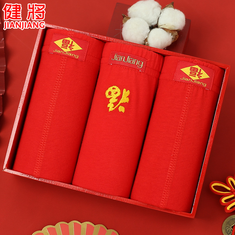 【产品名称:健将男士内裤纯棉四角裤100%棉抗菌裆本命年大红色结婚龙年平角裤】