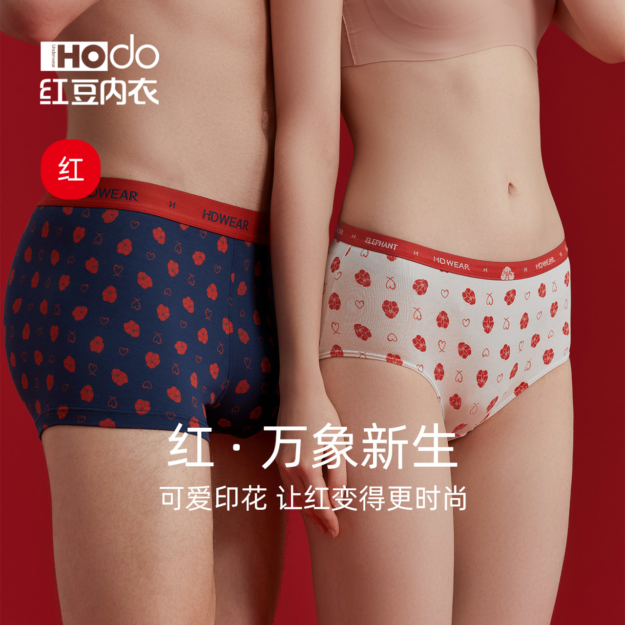 【产品名称:红豆情侣内裤纯棉裆男平角裤女士红色本命年可爱印花三角裤1条装】